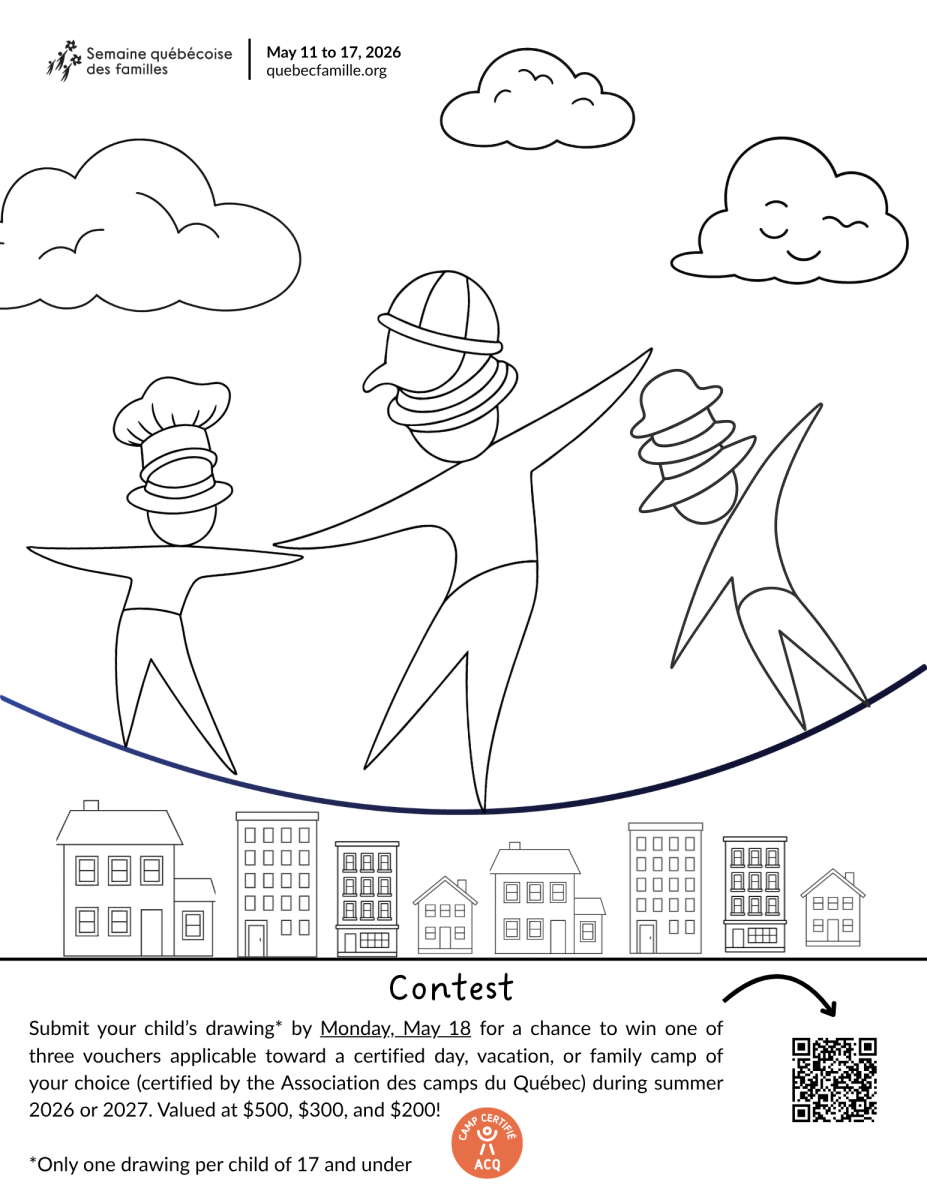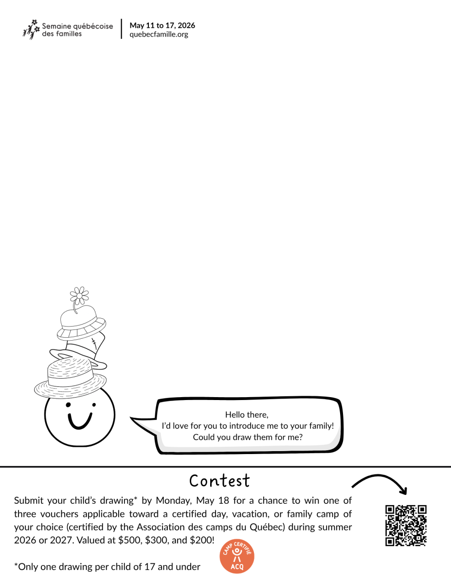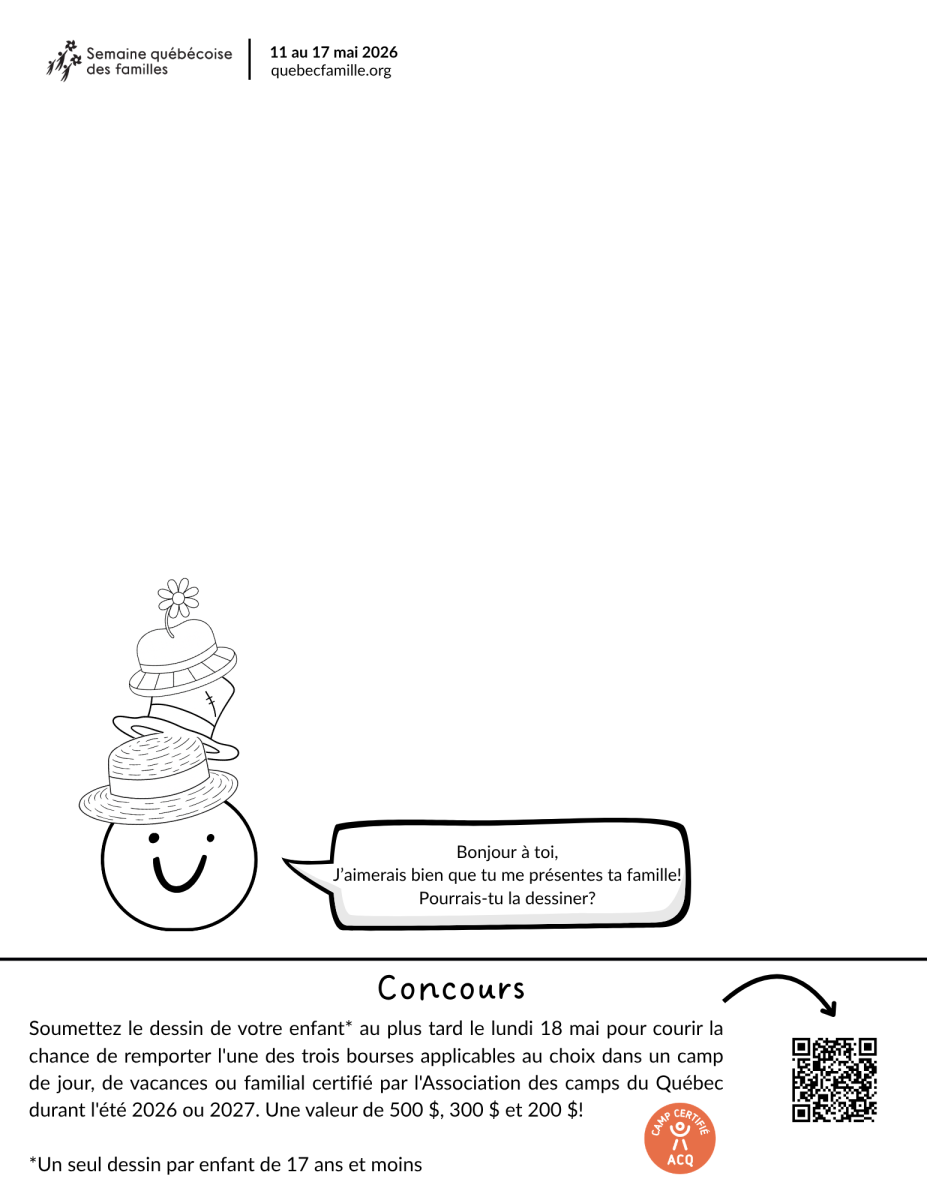 Dans le cadre de la Semaine québécoise des familles 2026, le Réseau pour un Québec Famille (RPQF), en collaboration avec l’Association des camps du Québec (ACQ), lance un concours de dessin.